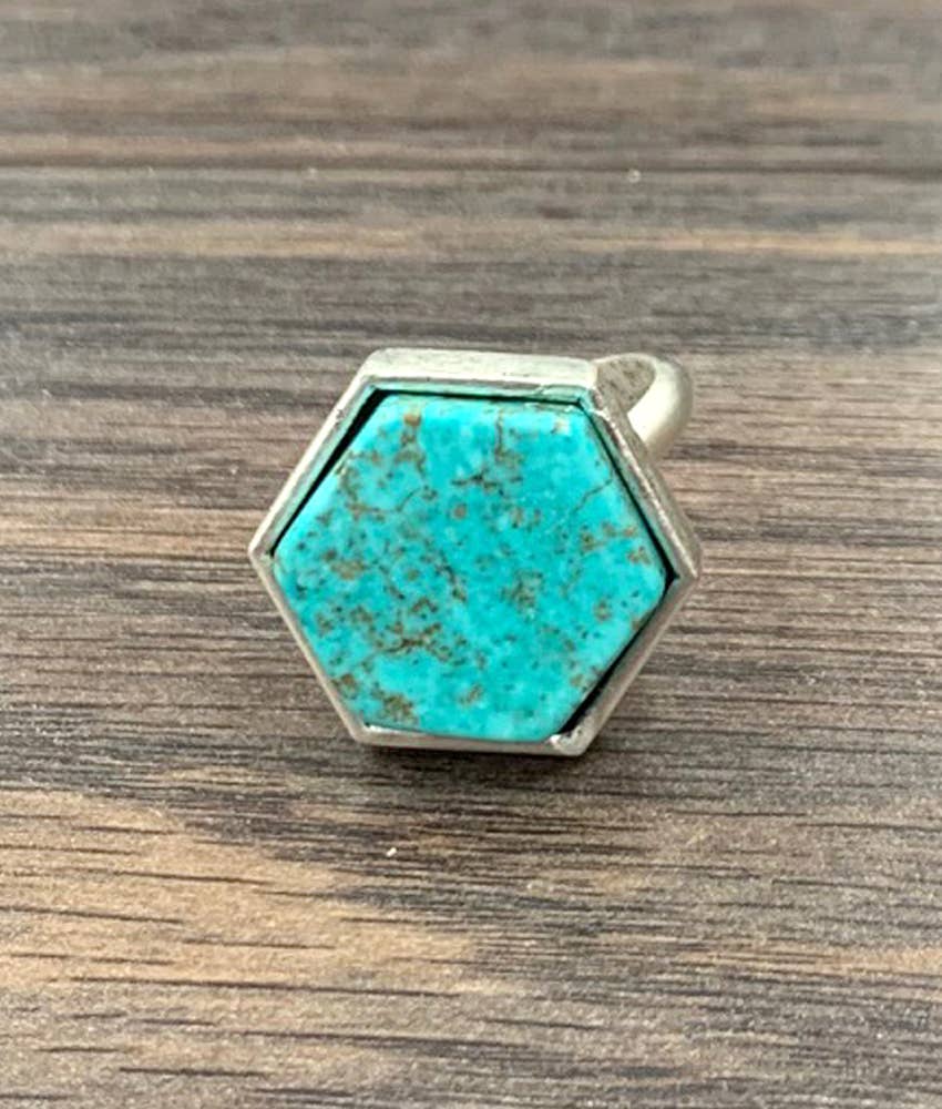 0.7" Long, Hexa Turquoise Ring, Brass Single Adjustable Band