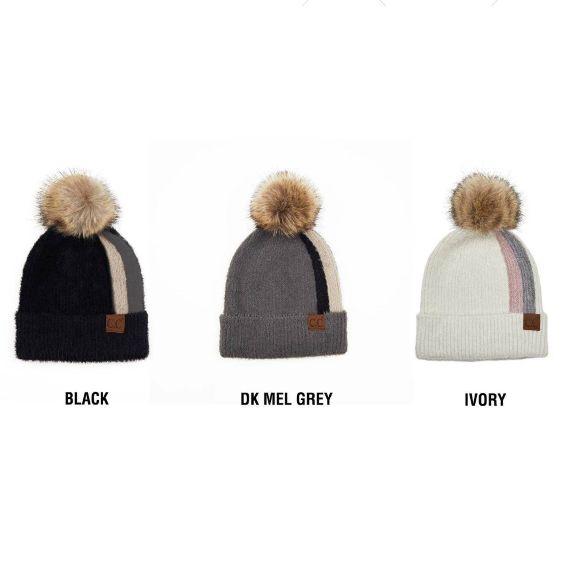 Look fly all season long and stay toasty-warm with this CC Striped Beanie! Made with top-notch faux fur and quality imported materials, this beanie is super soft and comes with an authentic C.C.® Branding. Plus, the stripe detail gives it an extra dose of style. Don't forget to fluff up the pom-pom with a hair dryer and a tooth comb—it's the secret to looking extra cozy and cute!