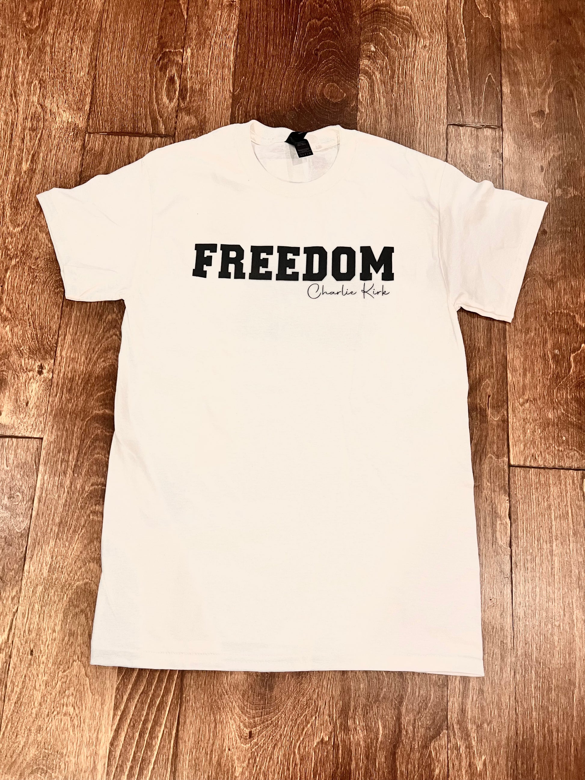 Freedom looks good on you. The Charlie Kirk Freedom Tee is a clean, everyday staple—available in Black, White, and Pepper—with a bold front print that says exactly what you stand for.