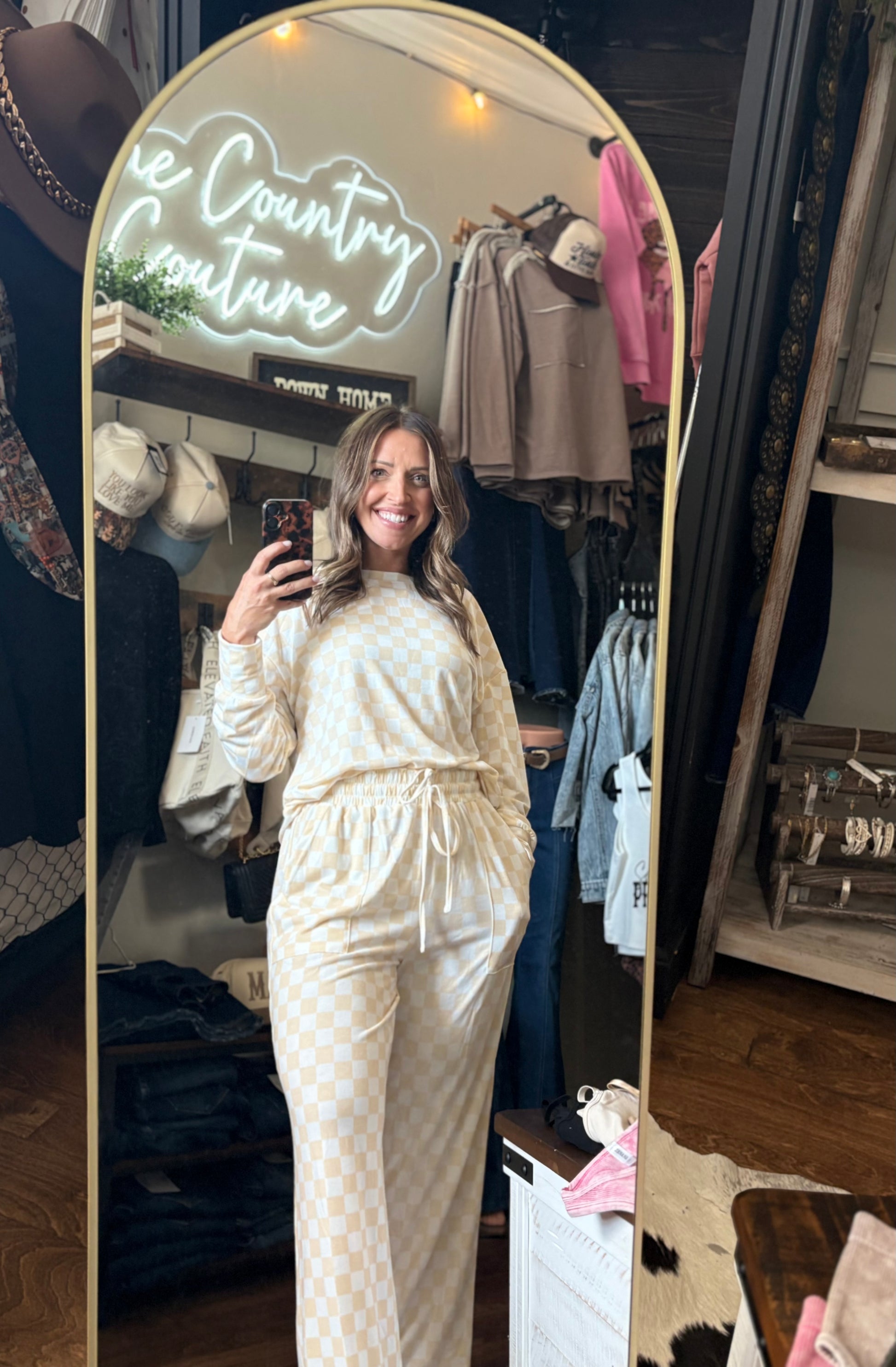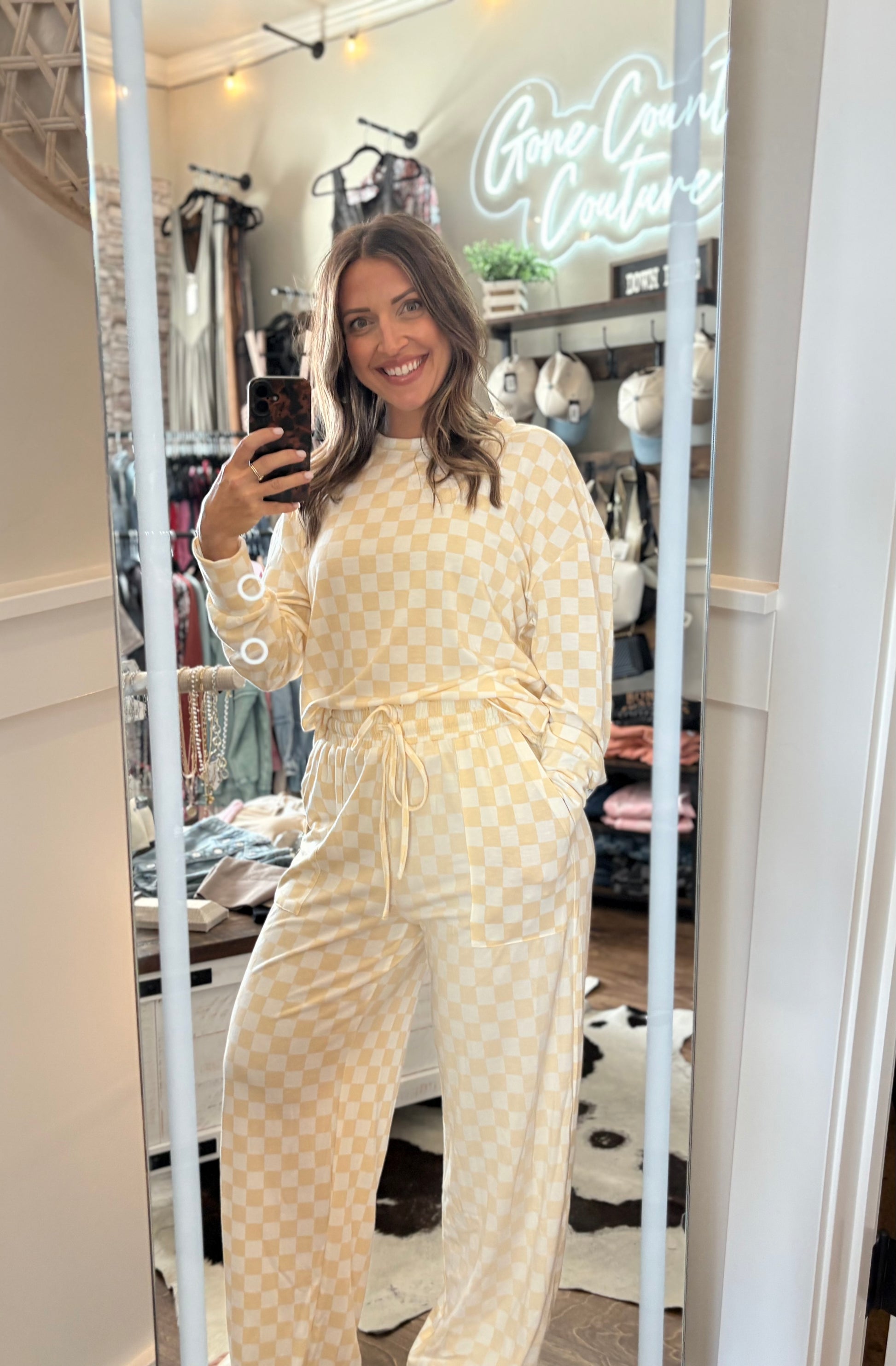This lounge set is perfect for relaxing at home or running errands. Made with a soft and comfortable fabric, this set features a classic checkered design that adds a touch of style. With its versatile and practical design, this lounge set will provide both comfort and fashion to your daily activities.