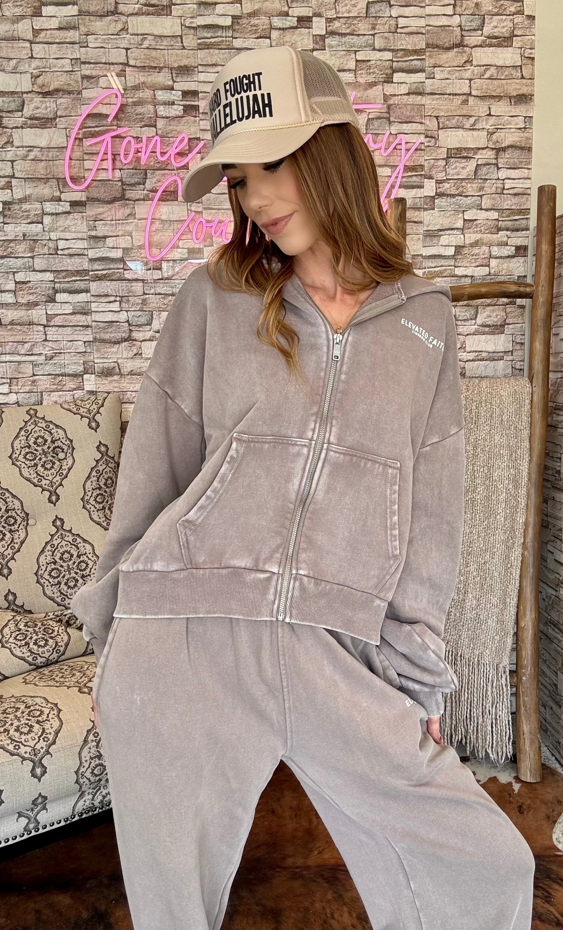 Embrace divine comfort in our Elevated Faith signature full-zip hoodie, crafted from 100% pure cotton for unmatched softness. The relaxed silhouette and thoughtful design elements create a piece that moves seamlessly from morning devotionals to your day out. This hoodie makes a bold statement while keeping you comfortable. "I press on toward the goal to win the prize for which God has called me heavenward in Christ Jesus." -Philippians 3:14 Size: Model is 5'6" and wearing a size Small. Fit: Oversized, Unisex Fit Color: Moon Rock Composition: 100% Cotton Features: Garment Dyed, Super Soft, EF Logo Zipper