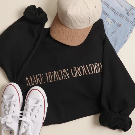 The MAKE HEAVEN CROWDED Embroidered Fleece Sweatshirt showcases the motivational slogan “MAKE HEAVEN CROWDED” in subtle tone-on-tone embroidery across the chest. Crafted from heavyweight fleece, this sweatshirt ensures exceptional warmth and cozy comfort. Its clean, understated design makes it a stylish and inspiring addition to your wardrobe.