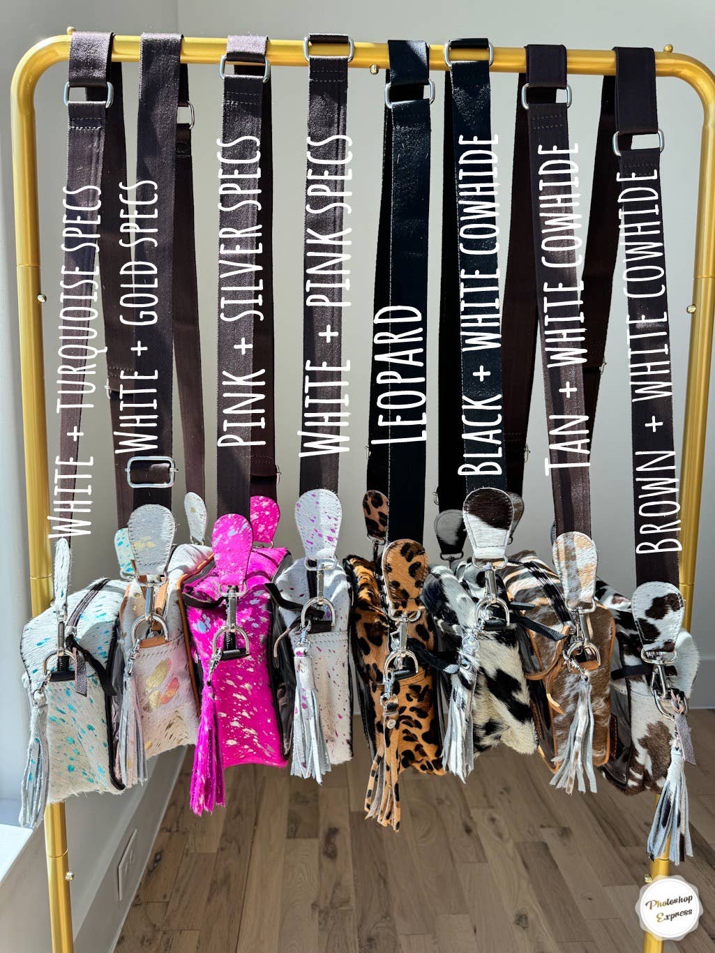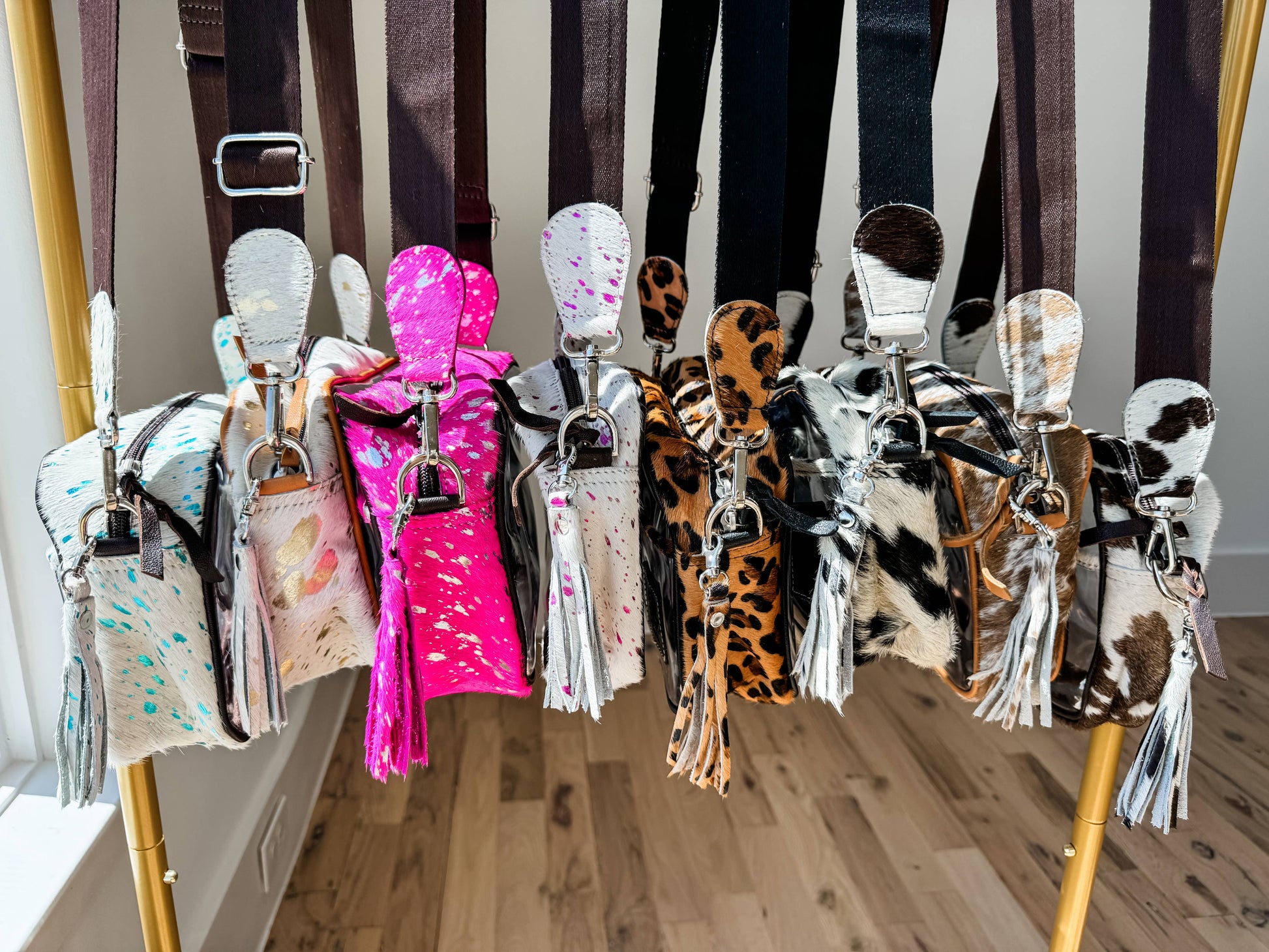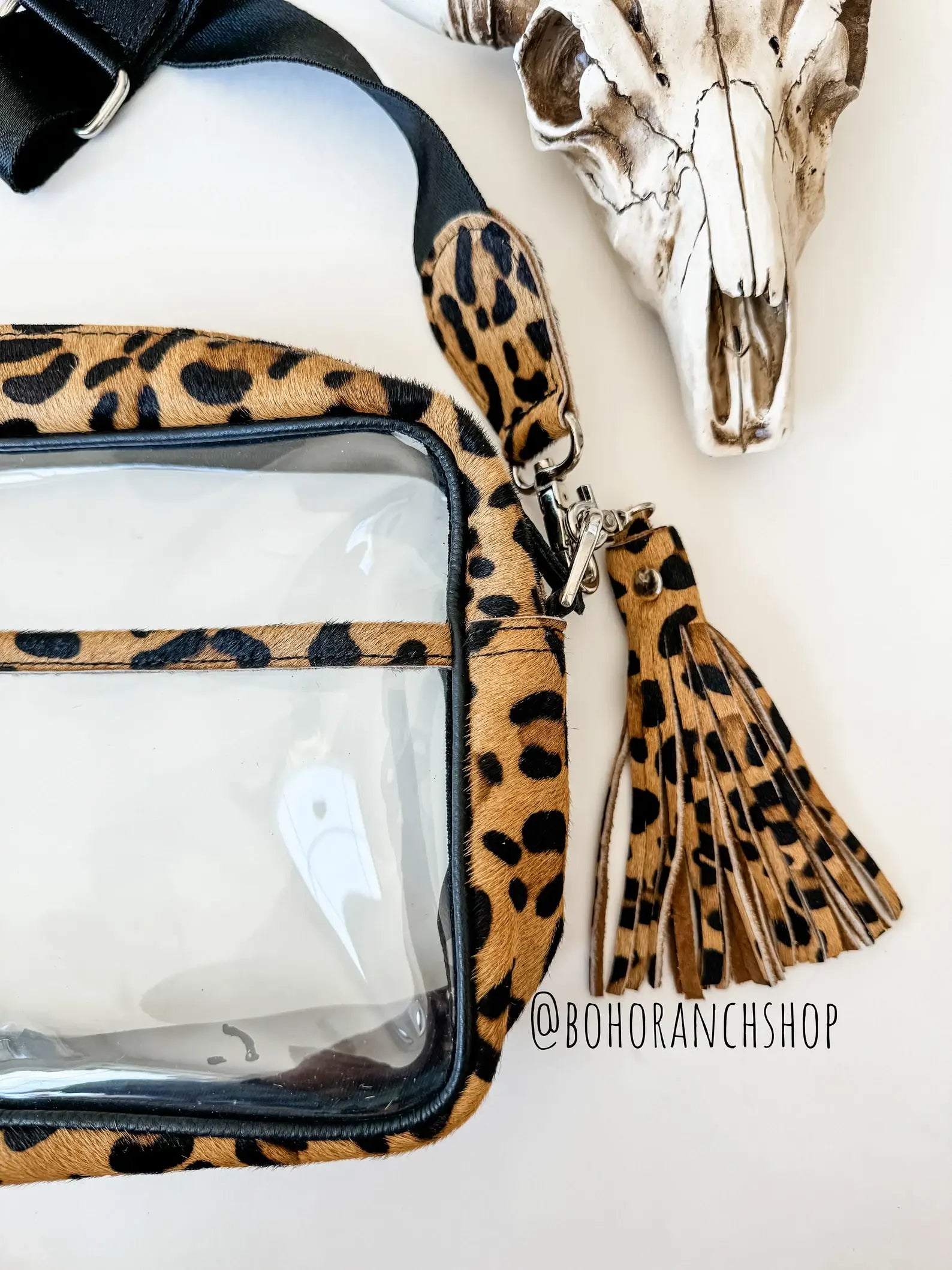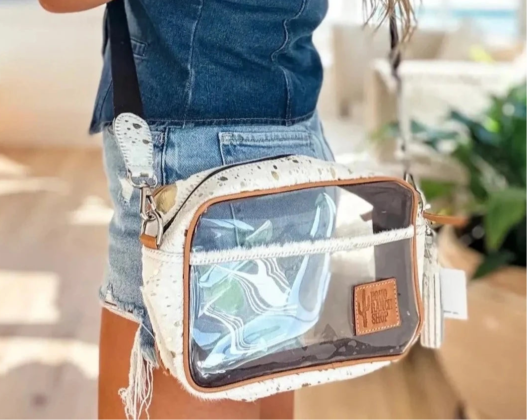 Cowhide Stadium Purse with Vinyl Clear Crossbody Strap. Perfect for phone, keys, makeup and money. Includes genuine hairon tassel keychain. Complies with venue's clear bag policy. Measures 11" W x 7" H x 3" D.