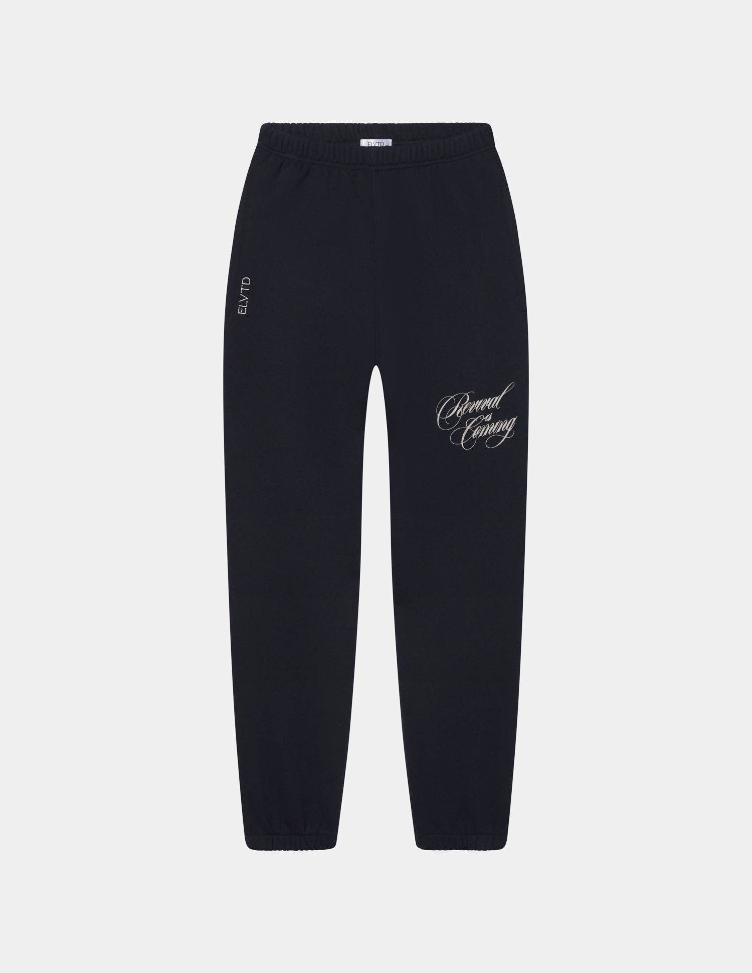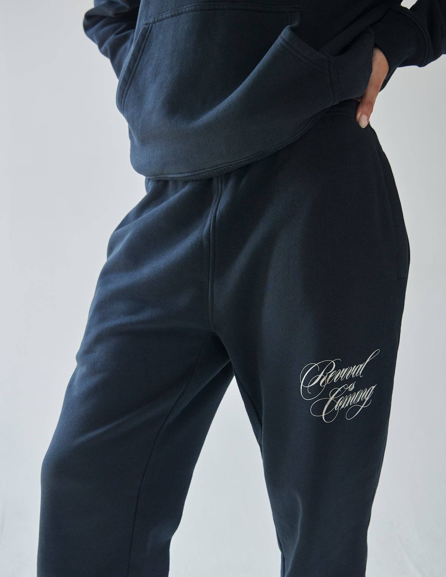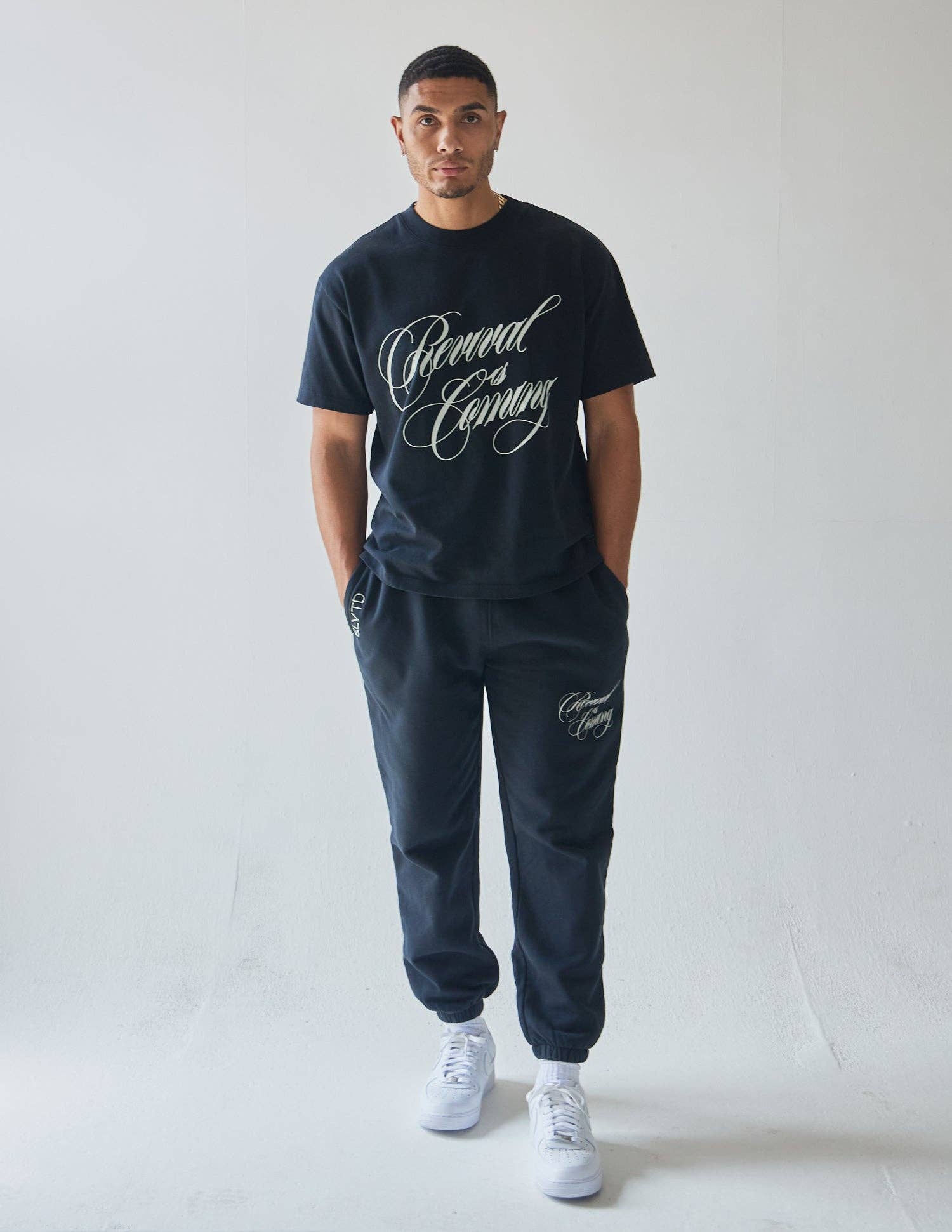 Our Revival Sweatpant in nightfall. 100% premium combed cotton. 450gsm. Revival print on left leg. ELVTD logo embroidery on right pocket. Hidden drawcords.