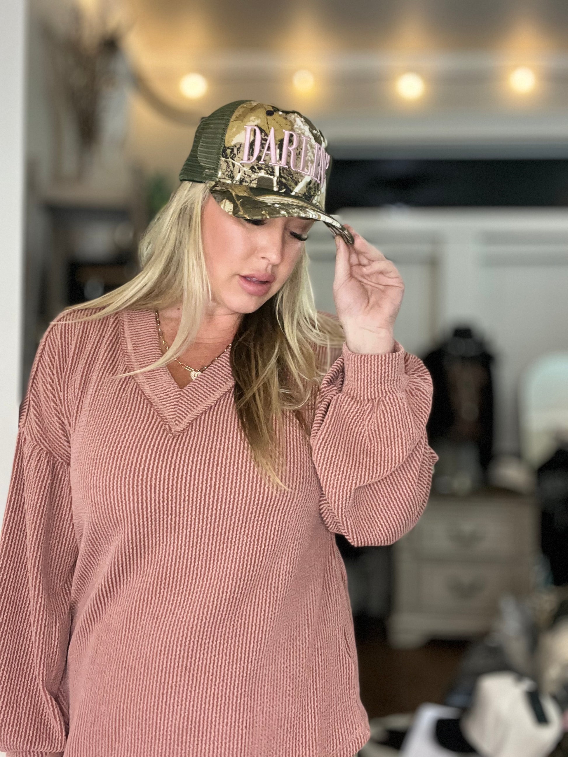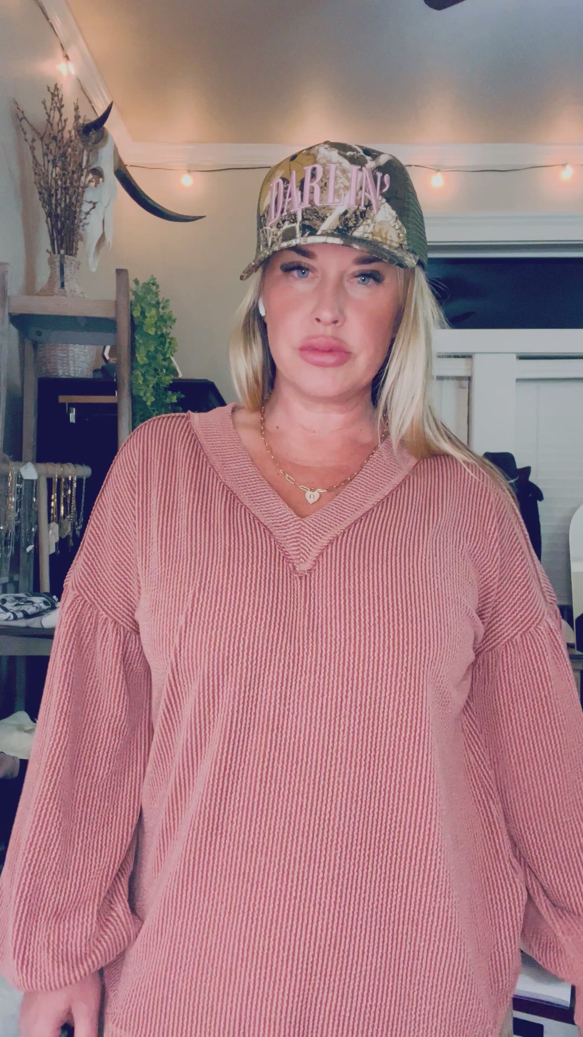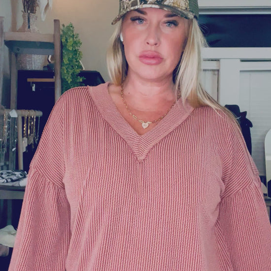 Comfy cozy rib like material with slouchy arms Upgrade your wardrobe with this ribbed v-neck oversized knit top. Its comfy and cozy rib fabric offers unbeatable warmth and comfort, and the slouchy arms add a stylish and relaxed touch. Perfect for cozy nights in or casual outings, this knit top will keep you looking and feeling your best.