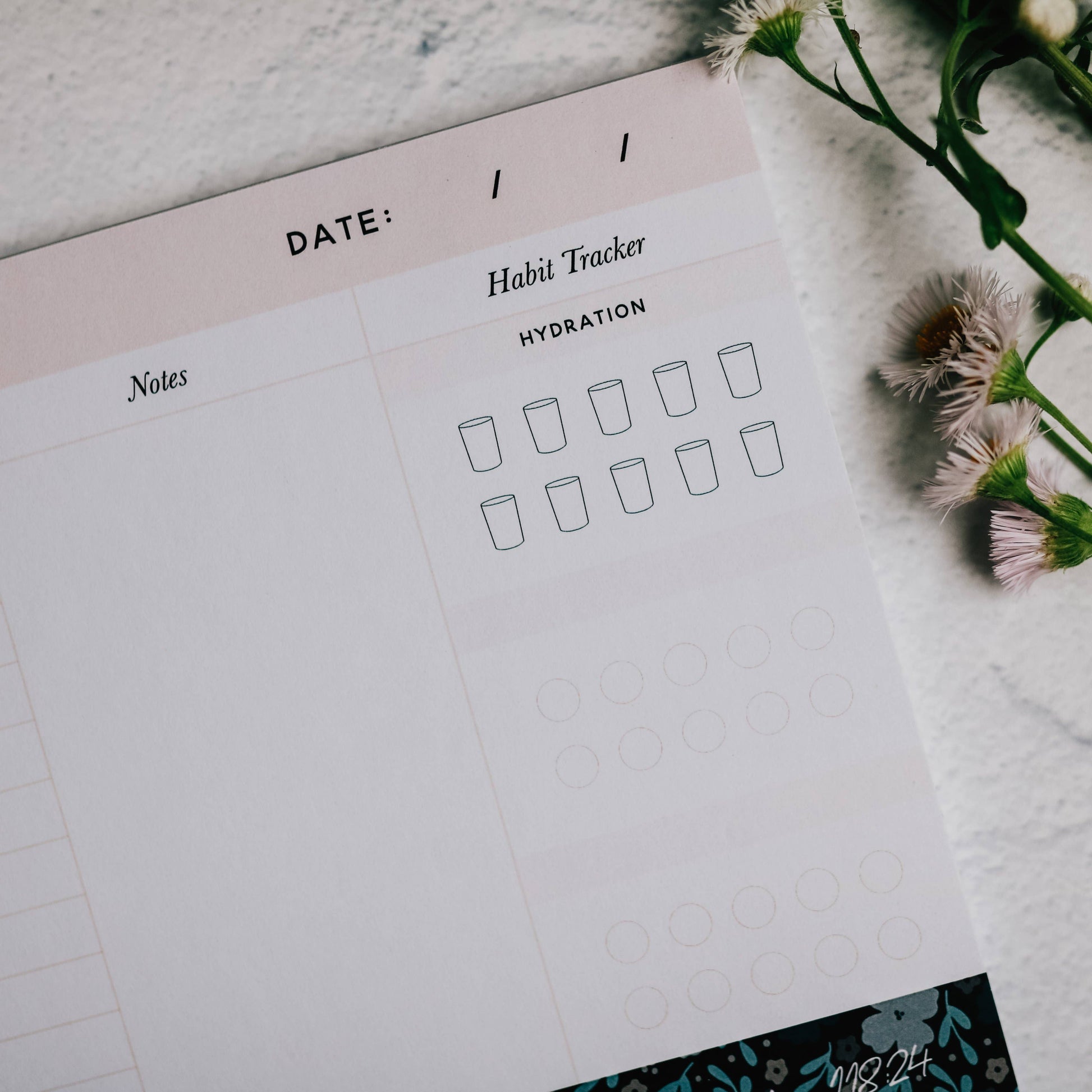 This is an 8.5"x5.5" notepad with a floral design and sections for Agendas, To Do, Notes, and a Habit Tracker!