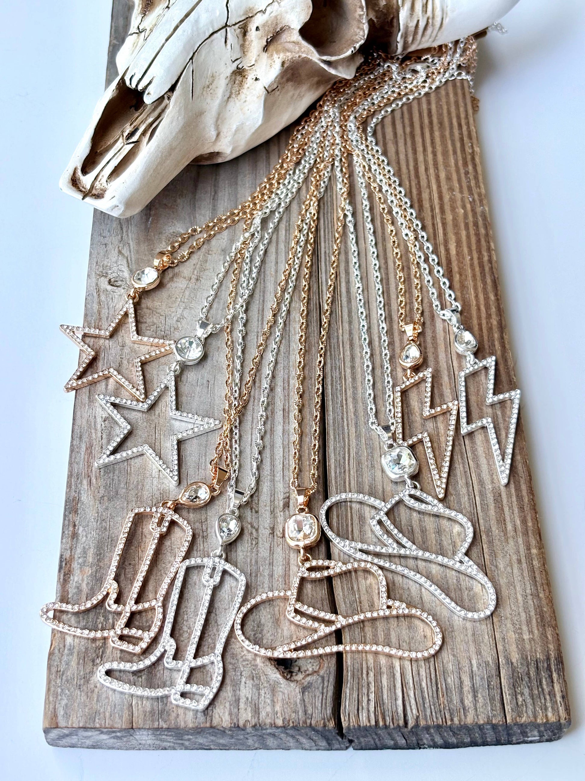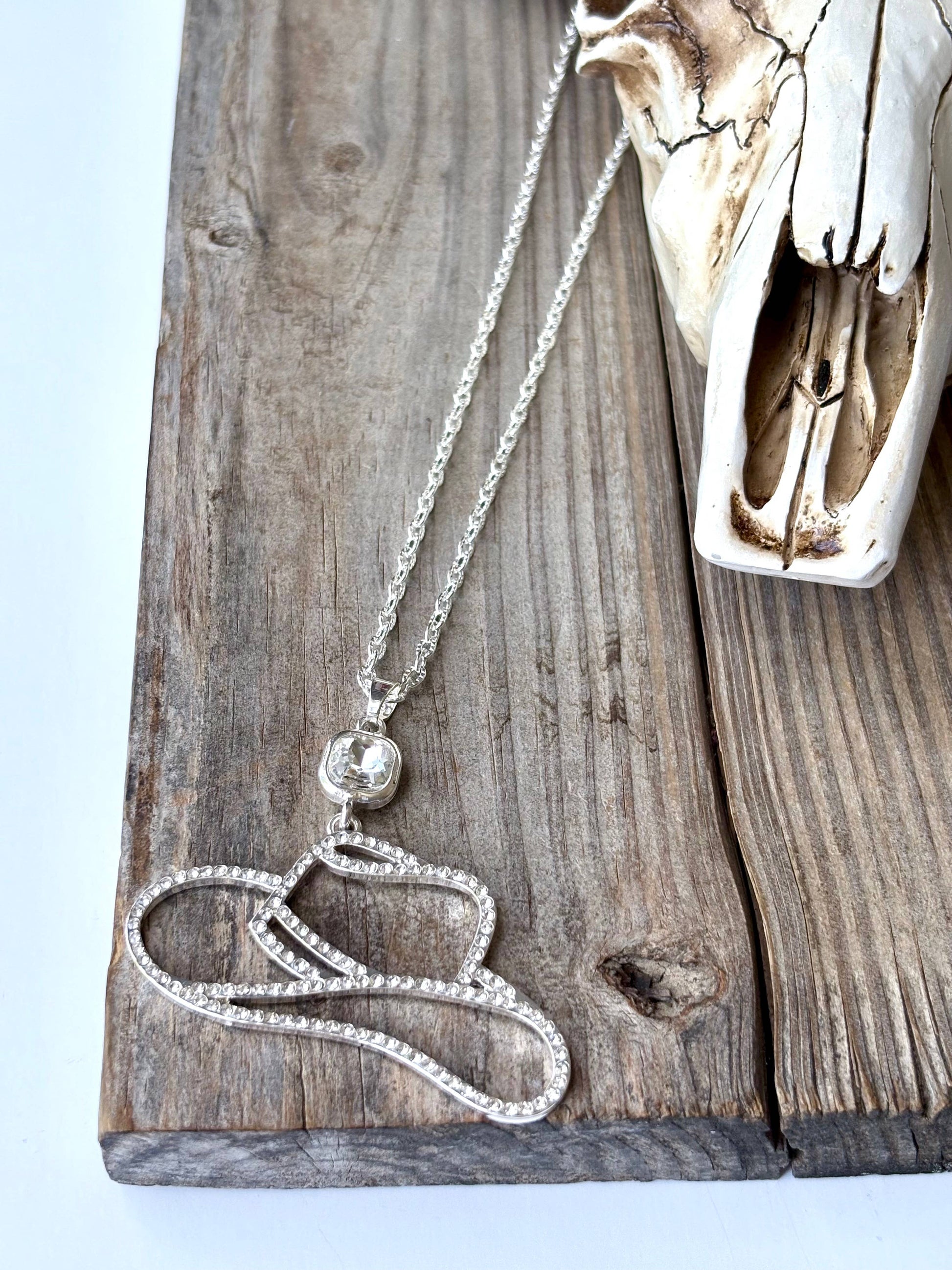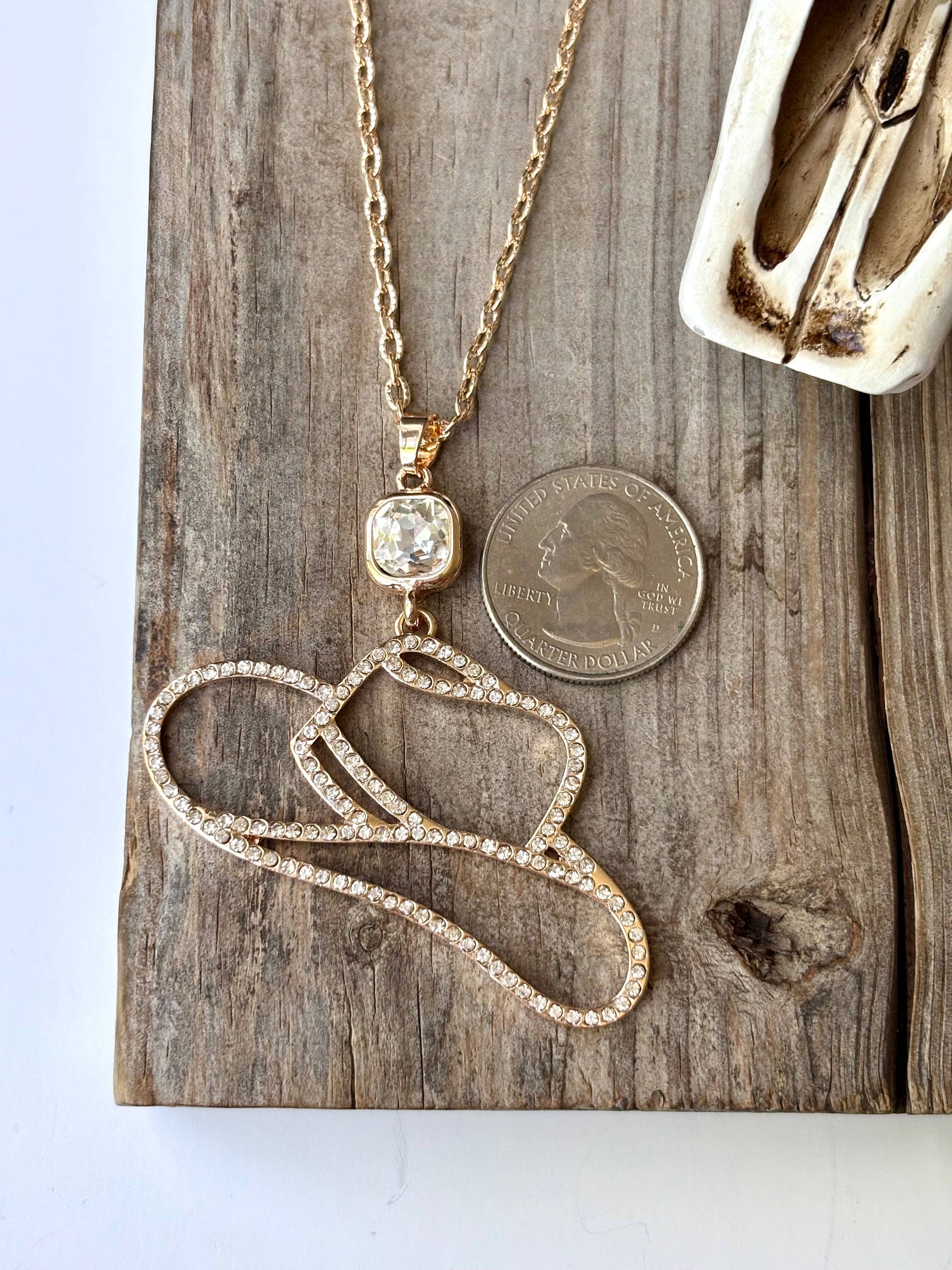 Western Style Cut Out Metal Frame w/ Rhinestone & Glass Stone Pendant Chain Necklace