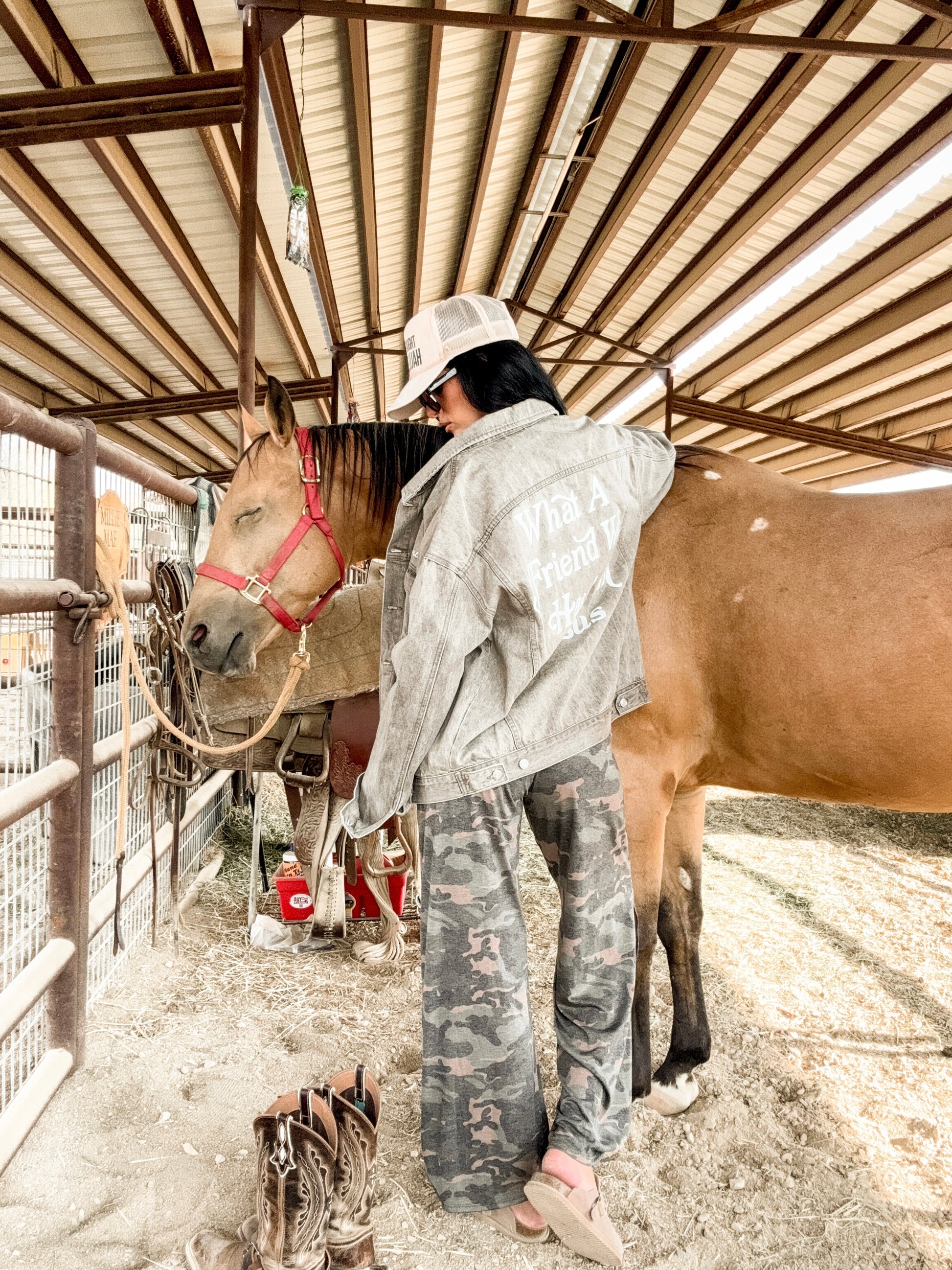 Jesus is our most faithful friend who knows our thoughts and failures yet cares infinitely deeply about our lives. Our What a Friend in Jesus Grey Denim Jacket features 13 oz heavyweight denim, a hand-drawn art pocket lining, back waist tabs for an adjustable fit, welt side pockets, and so much more! Oversized Fit Color: Grey Denim Composition: 100% Cotton Features: Heavyweight Denim, EF logo buttons, Chainstitch logo embroidery